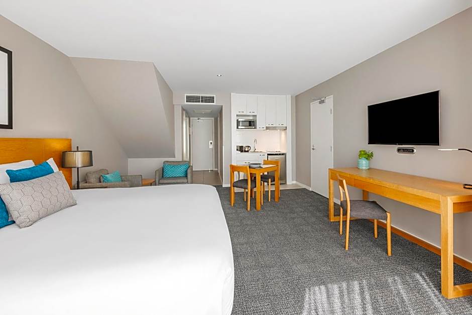 Please note that our comfortable and compact Standard rooms do NOT have a balcony and no kitchenette. There is a Queen bed option only in these rooms. No additional bedding can be added and it is suitable for up to 2 people only. This hotel style room features tea and coffee making facilities, a flat-screen TV and a work desk. There are no sofas or lounge chairs in these apartments.